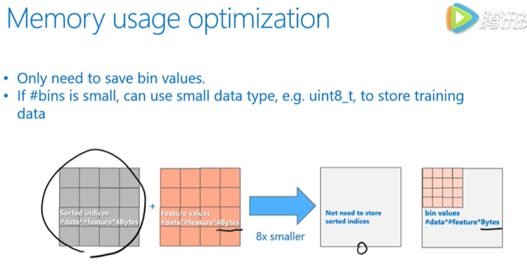 首先,我们不需要像XGB那样,存储预排序对应的data的序列,也就是灰色方格,因此这个代价就变成了0,另外用 bin 表示 feature 可以有效减少占用的存储空间(一般bin不会设置太多)。