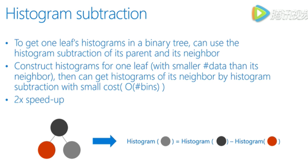lgb还使用了直方图做差的优化,可以观察到一个叶子节点上的直方图可以由它的 父节点直方图减去兄弟节点的直方图来得到,根据这点,我们可以构造出来计算数据量比较小的叶子节点直方图,然后用直方图做差得到中间较大的叶子节点的直方图,达到加速的效果。