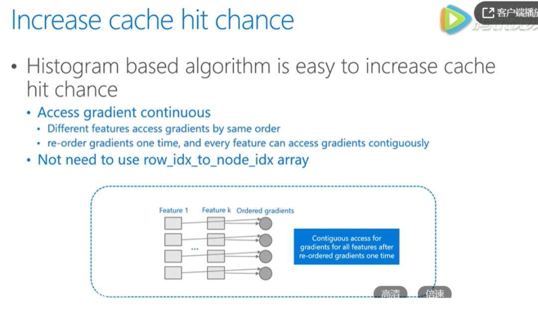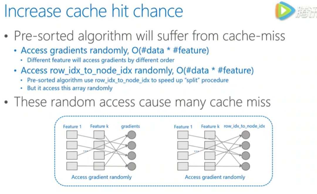 pre-sorted算法中有两个操作频繁的地方,会造成 cache missed 。对梯度的访问,在计算gain时需要用到梯度,不同的 feature 访问梯度的顺序是不一样的并且是随机的。对于索引表的访问,pre-sorted有个行号和叶节点号的索引表,可以防止数据切分的时候对所有的 feature 进行切分。访问梯度也一样,所有的 feature 都需要通过访问索引表,所以都是随机访问,会带来非常大的系统性能的下降。