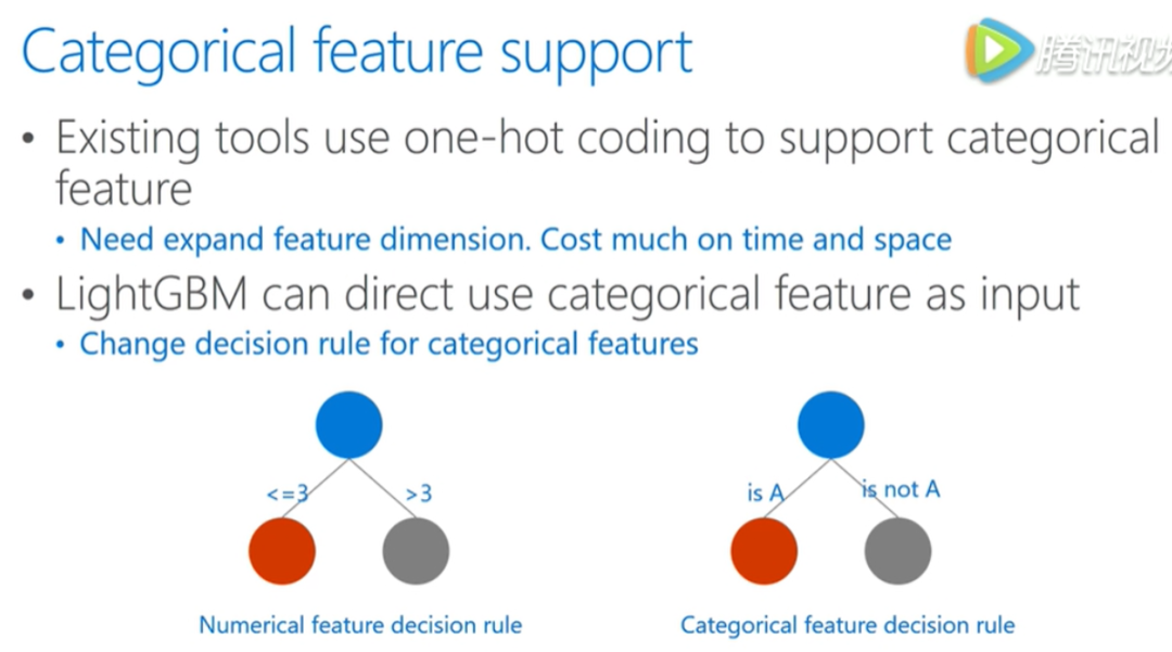 传统对的机器学习算法不能直接输入类别特征,需要先离散化,这样的空间或者时间效率都不高。lgb通过更改决策树算法的决策规则,直接原生支持类别特征,不许额外离散化。速度快了8倍以上。