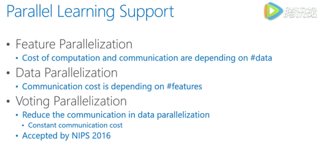 是对于数据并行的优化,数据并行的瓶颈主要在于合并直方图的时候,空间代价比较大,根据这一点,基于投票的方式,只合并部分特征值的直方图,达到了降低通信量的目的。