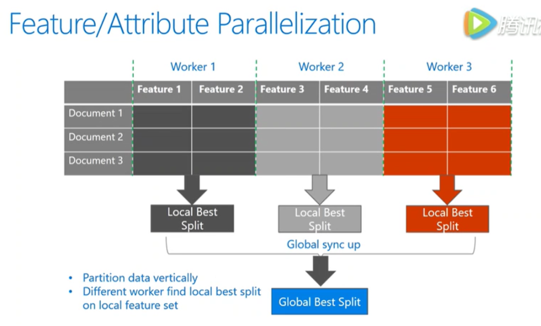 通过垂直切分数据在不同机器上都用所有的数据样本点,但是有不同的特征,不同机器上寻找不同特征上的最优分割点进行全局的同步,得到全局的最优分割点。