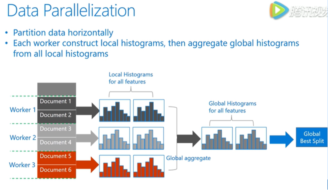data并行通过水平切分数据,让不同机器拥有不同的数据,并行的时候让不同的机器首先用稳定的数据构造好直方图,然后进行一个全局的直方图合并,在合并好的全局直方图上寻找最佳分割点。