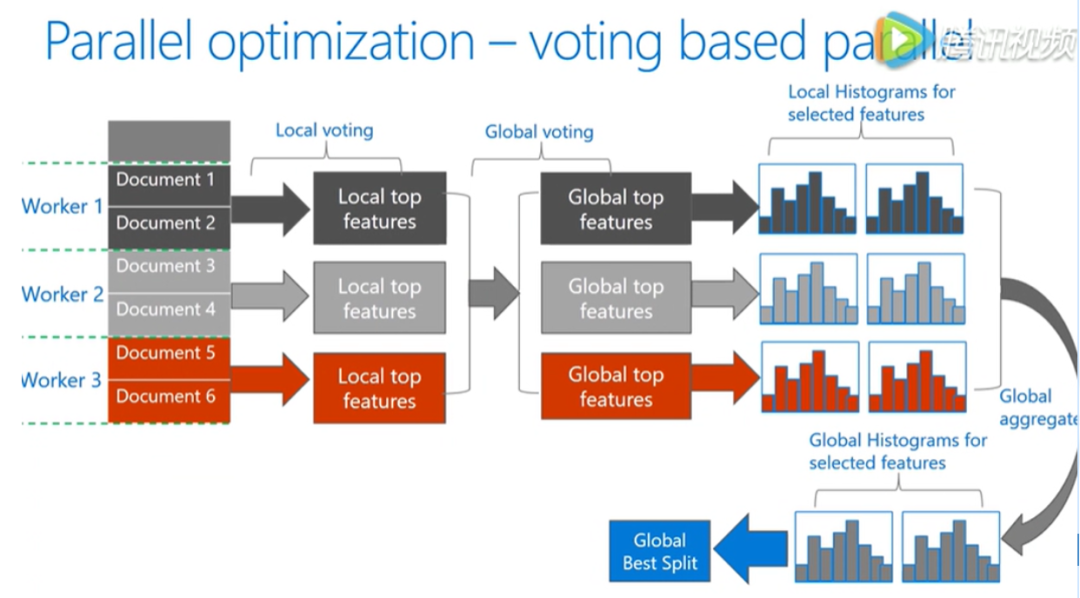首先通过本地的数据找到本地的 top features ,然后利用投票筛选出可能是全局最优点的特征,合并直方图时只合并这些被选出来的特征,由此减低了通信量。