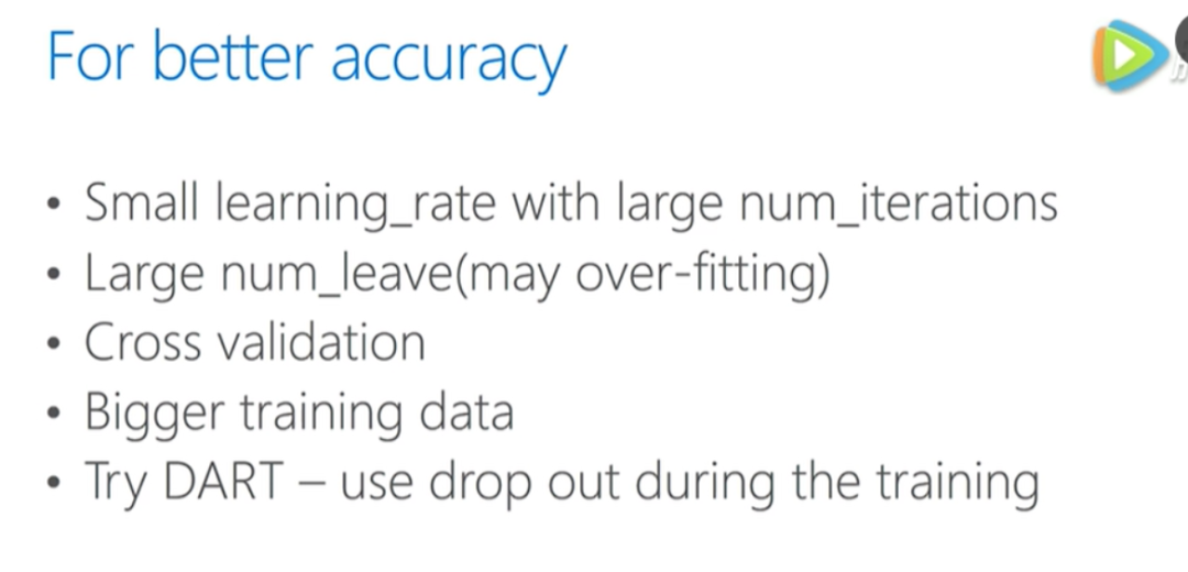 比较小的学习率,更加多的迭代次数,一般会提高正确率。过拟合情况下,增加叶子节点数也能提高精度。或者用交叉验证的方式,对比一些参数,找到更好的参数。训练数据越多,训练精度也有提升。