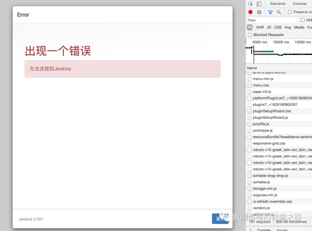选择安装推荐的插件这一步的时候可能会出错,提示无法连接到jenkins