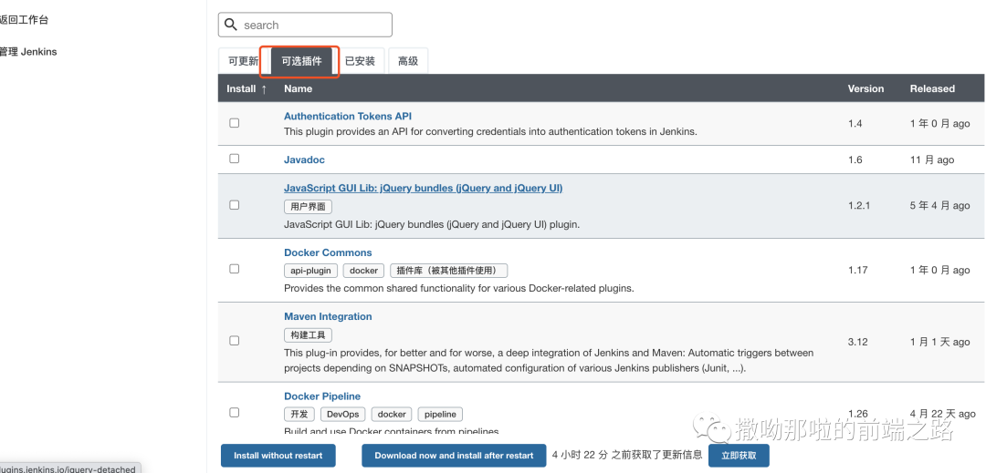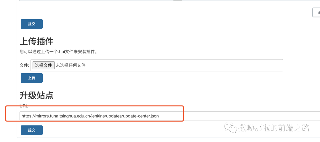 解决办法有两种1.通过访问当前jenkins的地址加路径/pluginManager/advanced,在系统设置里修改升级站点https://mirrors.tuna.tsinghua.edu.cn/jenkins/updates/update-center.json但这个方法有时候不管用。