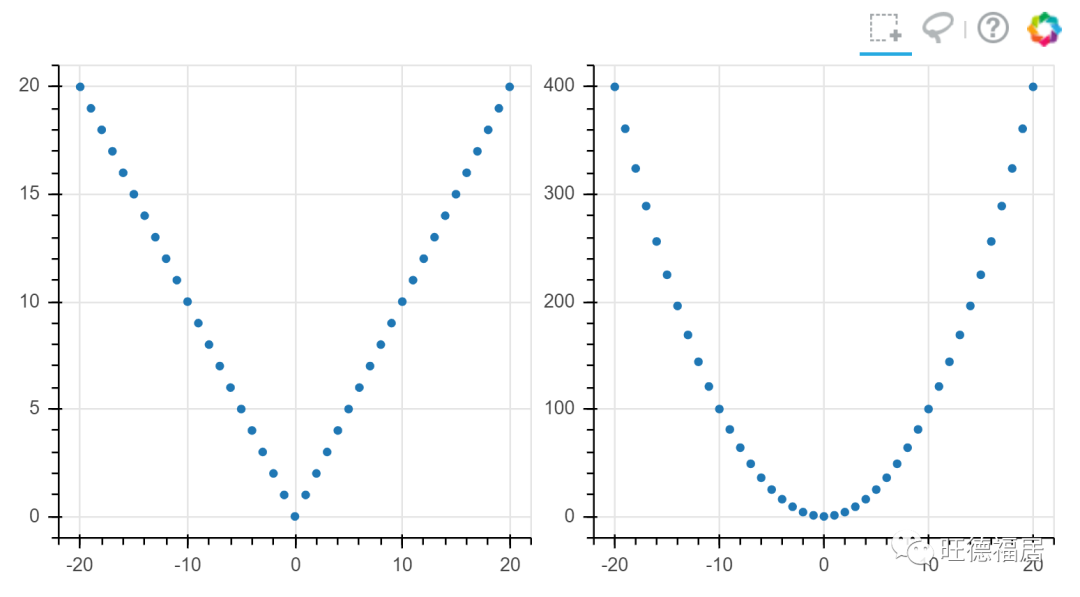 可以链接不同 Bokeh 绘图之间的各种交互操作。例如,可以链接两个(或多个)图的范围,以便在平移(或缩放)一个图或更改其范围时,其他图将一致更新。也可以在两个图之间链接选择,以便在一个图上选择项目时,第二个图上的相应项目也将被选择。