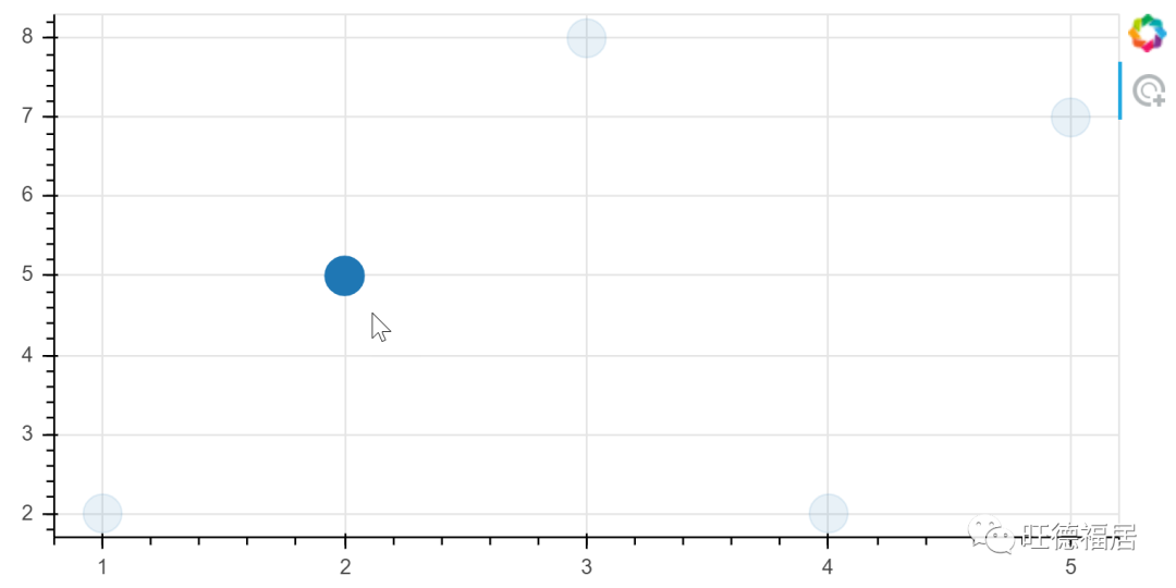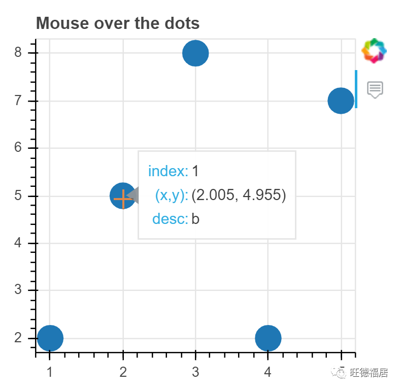 Bokeh 提供悬停工具,每当用户将鼠标悬停在特定 glyph 上时,该工具便会在弹出窗口中显示附加信息。基本的悬停工具配置相当于提供 (name, format)