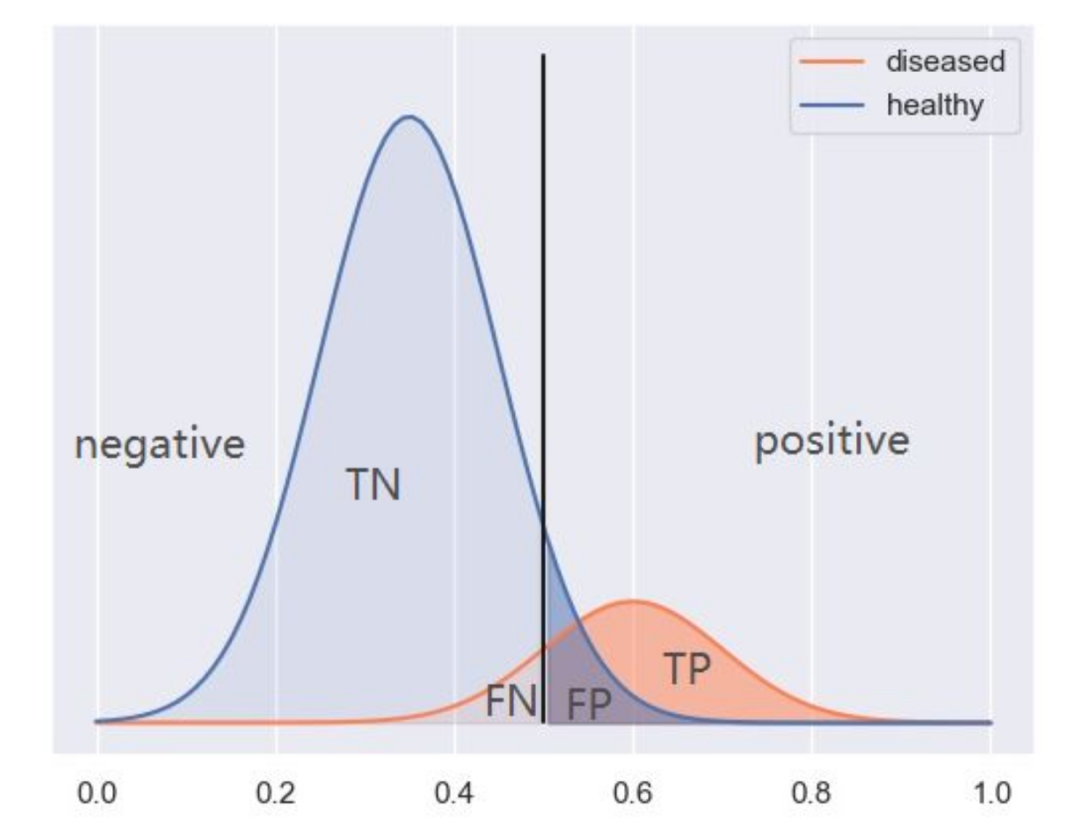 图中蓝橙两条曲线反映了1和0两类真实数据的分布情况,黑色的直线表示分类器的阈值,模型将黑线左边的样本标签预测为0,黑线右边的预测为1,因此也就产生了TP、FP、TN、FN四个值,进而我们也就可以计算真阳率和假阳率。当我们对不同的阈值进行遍历时,产生的 (假阳率, 真阳率) 坐标点也就可以连成ROC曲线,进而求得曲线下面积AUC。