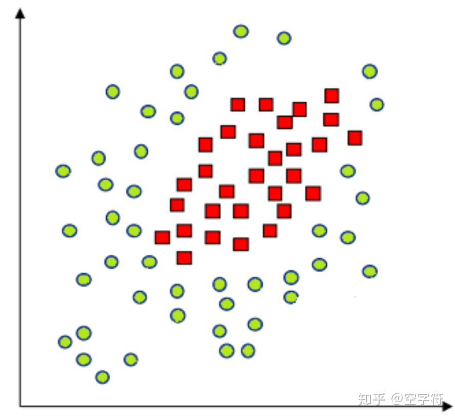 当两种数据的分布如下图所示时,通过简单的线性边界就无法实现划分,我们称之为线性不可分。