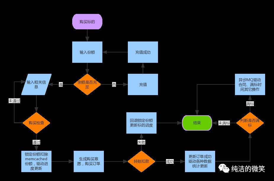 为何产生少募?少募是可能1000万的标的突然到980万就给满标了,这是因为在超募情况下我们完善了代码,用户一进来首先就是锁定购买份额,只有锁定购买份额才能进行下面的流程,如果锁定购买份额失败直接返回,这样虽然保证了在1000万份额在购买初期必须每一个用户只能锁定一份,但是在高并发的情况下,因为购买流程中有十几个分支,每一个分支失败就会退回锁定的份额,这样就会导致这样的现象,就是可能是并发一上来,马上就满标了,过了一会进度就回退回来了。