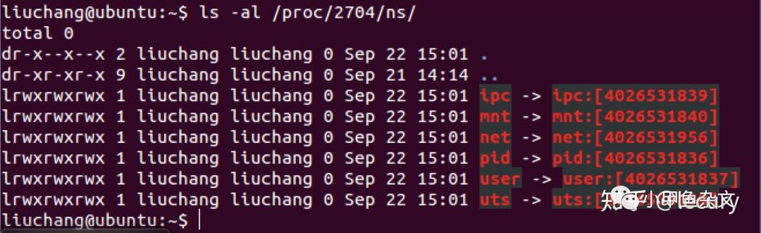 在3.8内核开始,用户可以在/proc/$pid/ns文件下看到本进程所属的Namespace的文件信息。例如PID为2704进程的情况如下图所示: