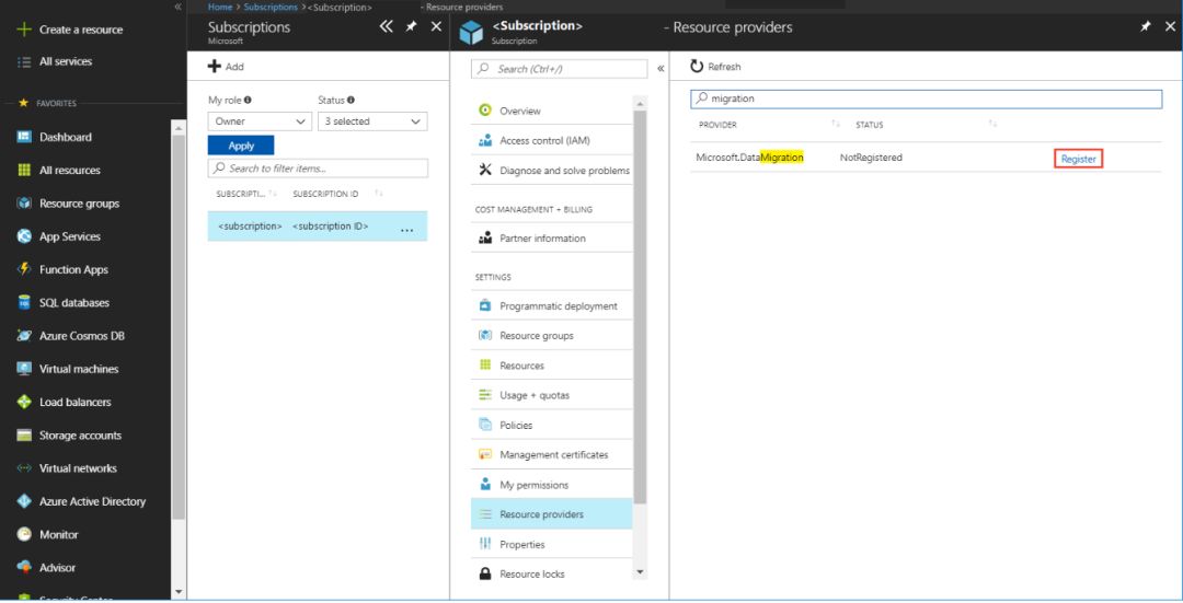 创建一个 Azure Active Directory 应用程序 ID,用于生成可由 DMS 服务用来连接目标 Azure 数据库托管实例和 Azure 存储容器的应用程序 ID 密钥。
