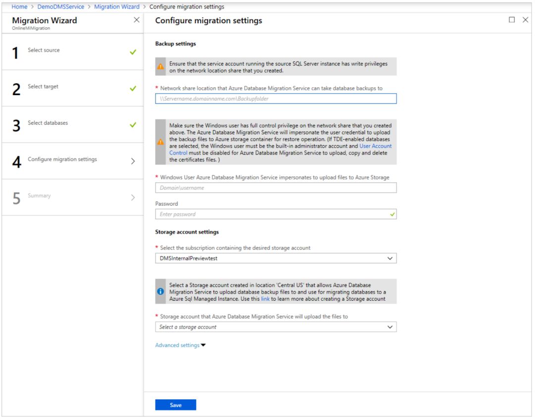 提供一个 SMB 网络共享,其中包含可由 Azure 数据库迁移服务用来执行数据库迁移的所有完整数据库备份文件和后续事务日志备份文件。