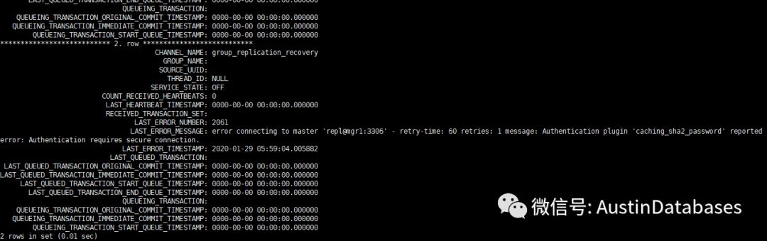 查看,发现是 error connecting to master 'repl@mgr1:3306' - retry-time: 60 retries: 1 message: Authentication plugin 'caching_sha2_password' reported error: Authentication requires secure connection.