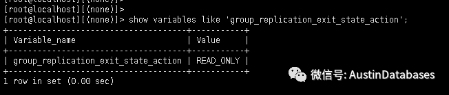 group_replication_exit_state_action插件变量是在MySQL 8.0.12中引入的,允许用户在服务器实例无意中离开组时配置组复制的行为。此功能主要是满足在某个节点离开集群后,离开系统的节点的对外展示何种状态。