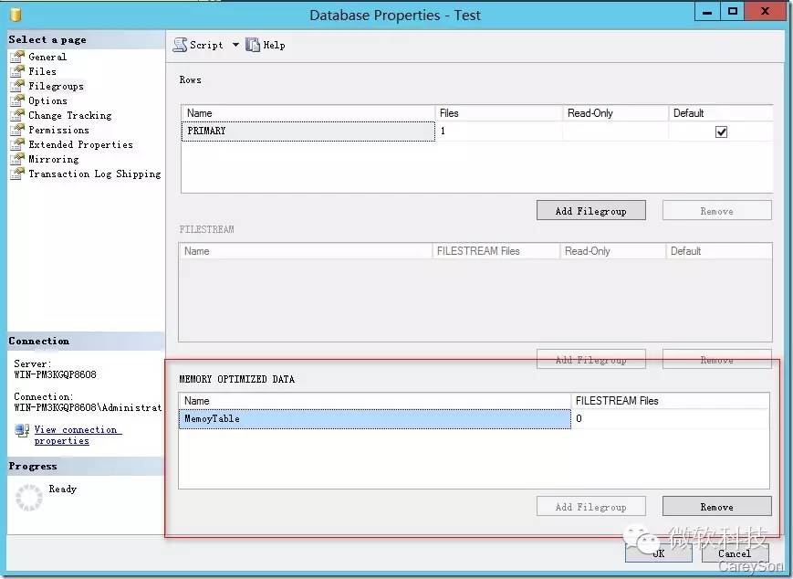 首先,内存优化表需要数据库中存在一个特殊的文件组,以供存储内存优化表的 CheckPoint 文件,与传统的 mdf 或 ldf 文件不同的是,该文件组是一个目录而不是一个文件,因为 CheckPoint 文件只会附加,而不会修改,如图 2 所示。