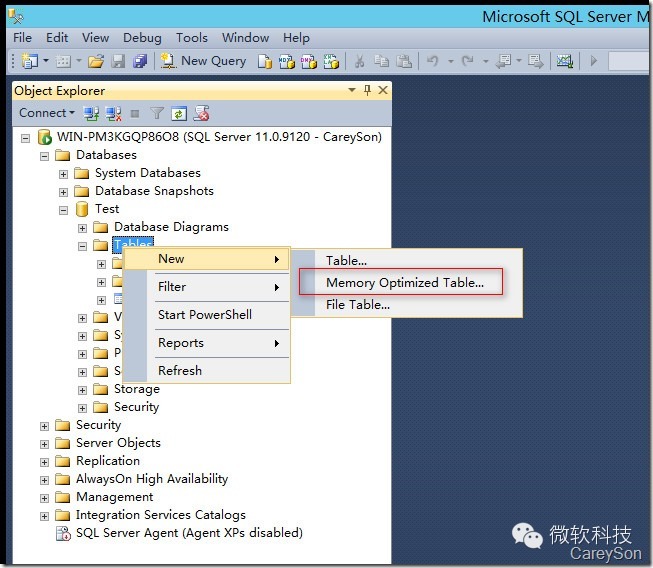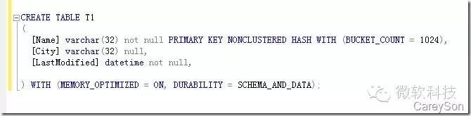 目前 SSMS 还不支持 UI 界面创建内存优化表,因此只能通过 T-SQL 来创建内存优化表,如图5所示。