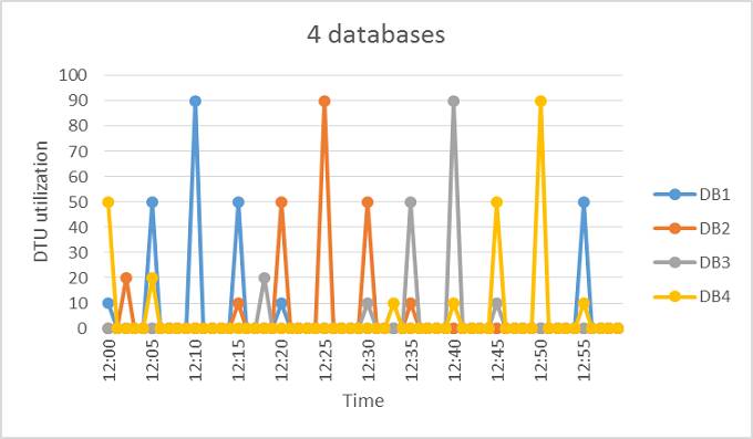 在所示的五分钟时间段内,DB1高峰最高达到90个DTU,但其整体平均使用量低于五个DTU。在单一数据库中,运行此工作负荷需要S3性能级别,但在低活动期间,大多数资源都处在未使用的状态。