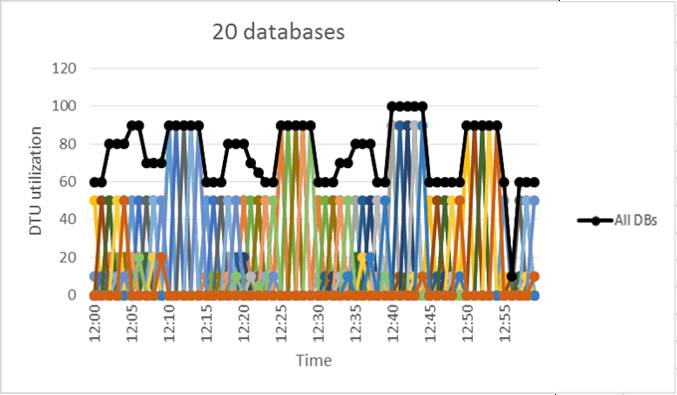 在上图中,黑线表示跨所有20个数据库的聚合DTU使用量。其中表明聚合DTU使用量永远不会超过100个DTU,并指出20个数据库可以在此时间段内共享100个eDTU。相比于将每个数据库放在单一数据库的S3性能级别,这会导致DTU减少20倍,价格降低13倍。