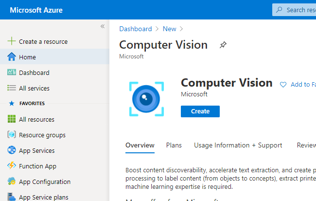 进入 Azure Portal,点击 + Create a resource,搜索并创建 Computer Vision。