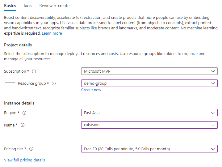 选择你的订阅(Subscription)、资源组(Resource group)、地区(Region),输入一个名字(Name),例如 catvision。计费模式(Pricing tier)可以根据自己的经济条件选择免费的F0和高富帅的 S1。