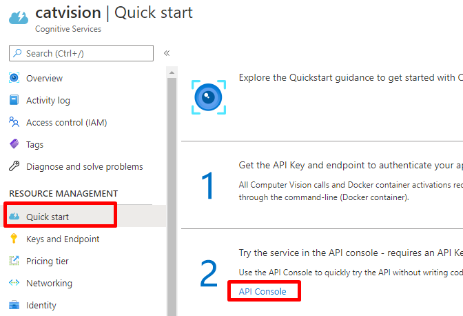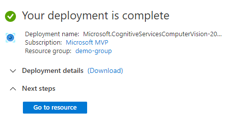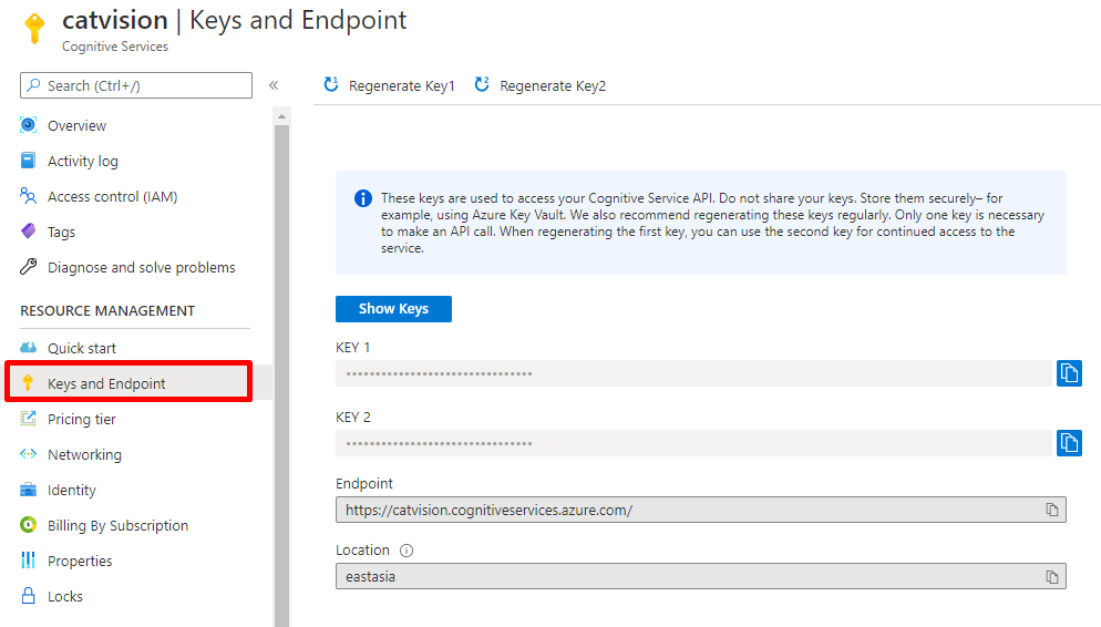 点击 Go to resource,进入创建完成的 Computer Vision。然后在 Keys and Endpoint 菜单里,复制Endpoint的链接以及任意一个 Key,我们在稍后会使用。