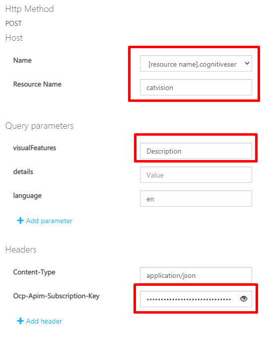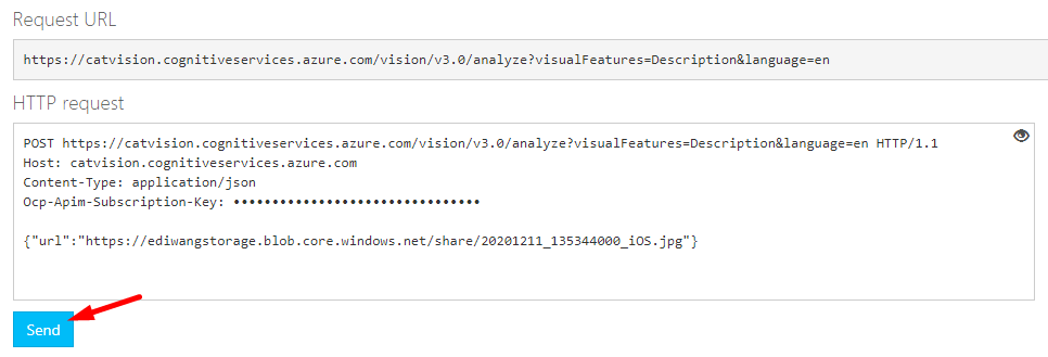 将 Host 选为 [resource name].cognitiveservices.azure.com,然后填写我们创建的资源名称,即 catvision。Query parameters 意思是要识别的元素类型,visualFeatures选择 Description,language为语言代码,默认en是英语,如果你需要中文结果,可以设置为 zh。最后填写 Ocp-Apim-Subscription-Key,即之前复制的 KEY1 或 KEY2的值。