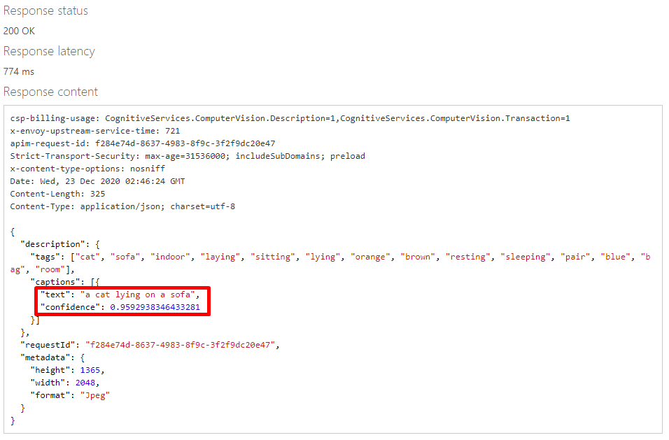 可以看到,Azure 准确识别了图片的内容,并以人类的自然语言描述了出来:a cat lying on a sofa。证明我们的Computer Vision有效。