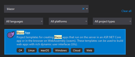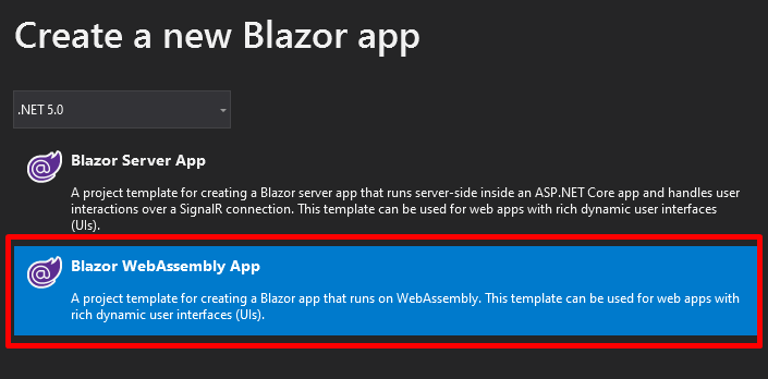选择.NET 5.0,Blazor WebAssembly App,完成创建。