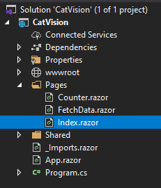 编写HTML代码。页面上有一个文本框,绑定到 ImageUrl 属性上,用来输入猫猫照片的 URL。一个按钮,用来发送请求给Azure,点击事件绑定到 ProcessImage 方法上。还有一个区域用来显示结果,绑定到 Description 以及 Tags 属性。