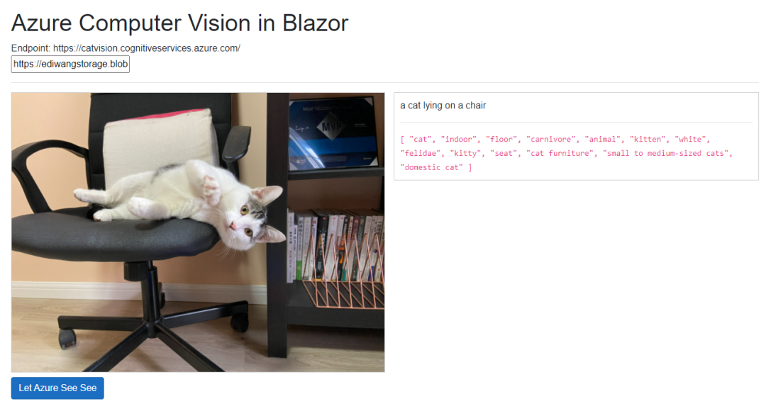 <button class="btn btn-primary" @onclick="ProcessImage">Let Azure See See</button>