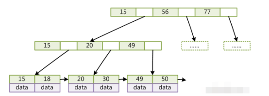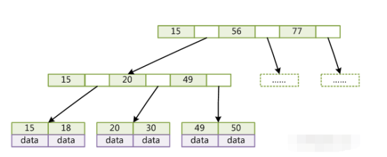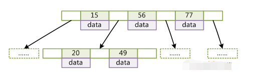 但是说b+树之前,咱们还是先来聊聊b-树是啥,从数据结构的角度来看,b-树要满足下面的条件:(1)d为大于1的一个正整数,称为B-Tree的度。(3)每个非叶子节点由n-1个key和n个指针组成,其中d<=n<=2d。(4)每个叶子节点最少包含一个key和两个指针,最多包含2d-1个key和2d个指针,叶节点的指针均为null 。(9)每个指针要么为null,要么指向另外一个节点。(10)如果某个指针在节点node最左边且不为null,则其指向节点的所有key小于v(key1),其中v(key1)为node的第一个key的值。(11)如果某个指针在节点node最右边且不为null,则其指向节点的所有key大于v(keym),其中v(keym)为node的最后一个key的值。(12)如果某个指针在节点node的左右相邻key分别是keyi和keyi+1且不为null,则其指向节点的所有key小于v(keyi+1)且大于v(keyi)。 上面那段规则,我也是从网上找的,说实话,没几个java程序员能耐心去看明白或者是背下来,大概知道是个树就好了。就拿个网上的图给大家示范一下吧:我们现在对id建个索引:15、56、77、20、49select * from table where id = 49select * from table where id = 15