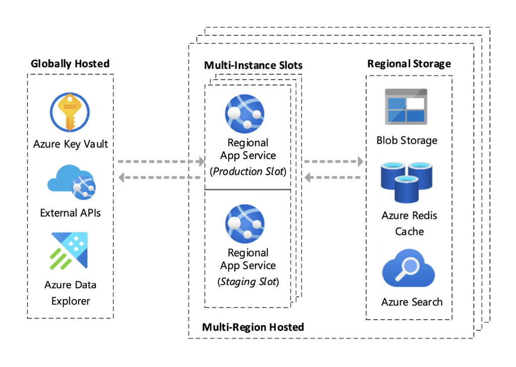 下图显示了App Service中托管的区域体系结构的特写。我们使用部署插槽来部署到开发,测试和生产环境。部署槽是具有自己的主机名的实时应用程序。我们可以在插槽之间交换内容和配置,同时保持应用程序的可用性。