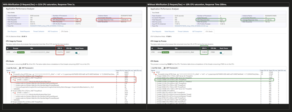 DaaS-.NET Profiler:确定代码瓶颈并评估改进。在此处,我们发现我们的HTML空格“ minifier”使我们的计算节点饱和。禁用它之后,我们验证了响应时间,并且CPU使用率显着提高。