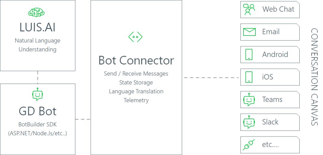 QnA机器人可以通过Bot Connector直接整合到Green Dot的现有产品中,如官网页面、手机App以及Teams、Slack等聊天工具。如今,在萨提亚·纳德拉先生带领下,微软开源开放,不再局限于自家技术,而是海纳百川、开放胸怀迎接各类先进技术接入,因此我们可以用任何语言、任何平台完成云服务的整合。
