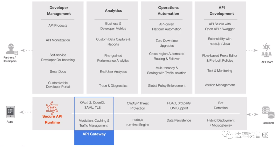 本座以前做项目常常拿API网关与API管理平台作比较,熟悉APIGEE的产品格局之后才了解到API网关之于AIP管理平台其实是很小一部分,甚至不能覆盖联机交互的全部功能。