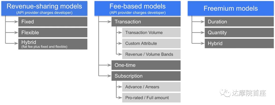 那我们说APIGEE的管理模式是由外而内,那势必也将主流的计价模式做成了标准化的服务供API供应商挑选,包括利润分账模式、费用分账模式和免费增值模式。