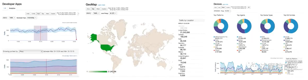 面向企业内部决策人员,常规的API监控(例如流量、故障率等)一定不是他们关注的焦点,他们更关注结合上述的计费模式,哪些业务更赚钱,然后在后续加大投入。为此APIGEE提供了丰富的时间、地理等维度的即时财务分析模型,方便CxO们根据市场变化急速做出响应。