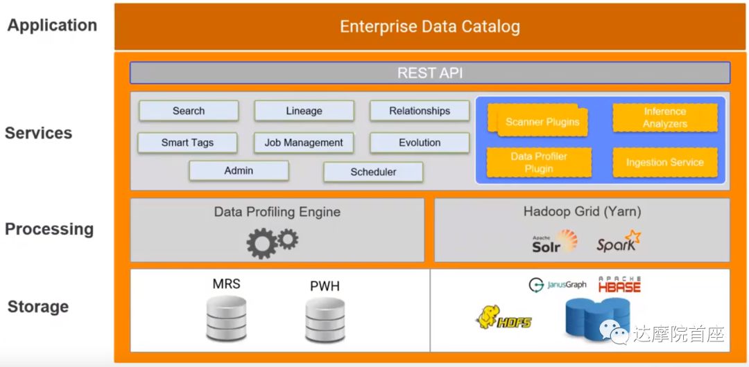 往上一层,对于接入的结构化数据的数据源,有剖析引擎(Data Profiling Engine)对数据集的唯一性,特征值频率以及数据集所属的数据域进行分析;在另一边Hadoop社区有自己的分布式引擎系统,例如用来快速将各类元数据加载到HBase的Spark组件,以及支持多条件搜索并建立实时索引的Solr组件。