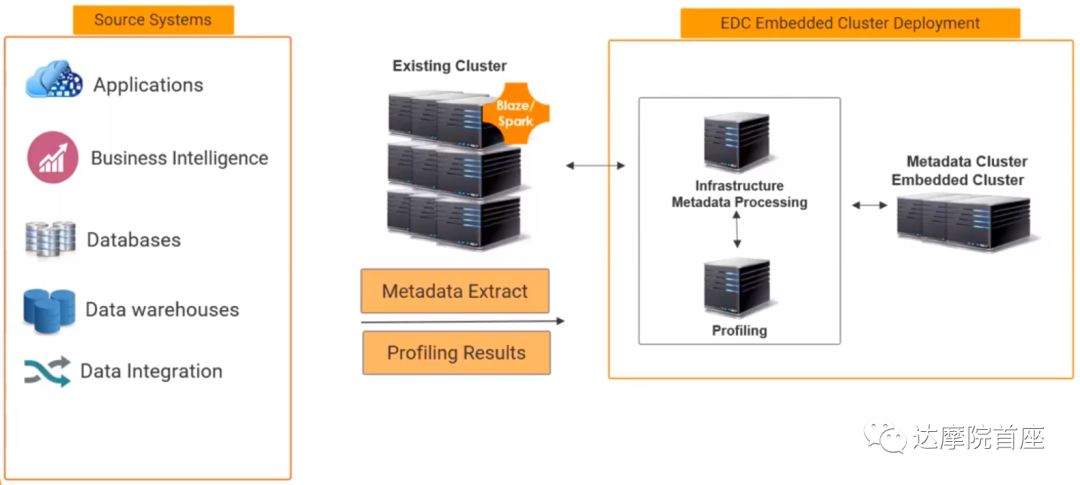 EDC的数据源通常来自各业务系统、BI系统、数据库、数仓和数据集成总线,经过存储层的元数据提取及数据剖析在EDC集群内建立元数据集群、创建元数据处理框架(内容包括MRS,监控模型库服务,集群服务,目录服务以及内容管理服务)以及数据域建制(Profiling)即数据集成服务。