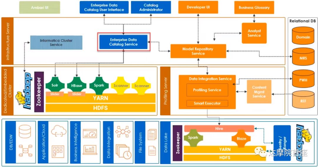 我们从下至上来看下EDC的一个架构,最下面是存储层,在这一层,EDC包含了传统的结构化数据库用来存储EDC的管理员数据、可视化配置数据、数据域的规则,runtime统计数据等等,其中一部分结构化数据来自于各接入应用的元数据,称为模型库服务(Model Repository Service,MRS)使所有接入的应用可以在一个关系型数据库中进行协同;另一部分结构化数据称为数据剖析仓库(Profiling Warehouse,PWH),用来存储数据剖析信息,例如剖析结果和计分卡结果。在存储层EDC也可以接入各种非结构化数据,例如Hadoop分布式存储系统以及其上的HBASE等开源产品。