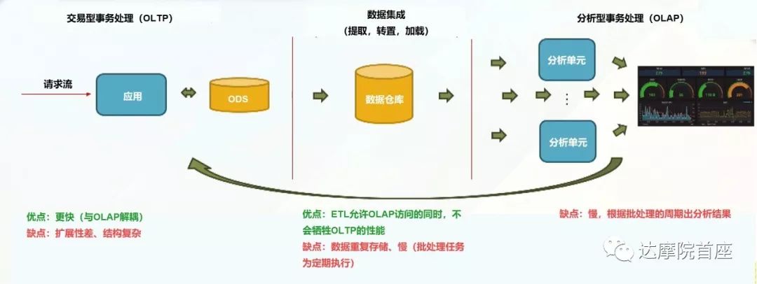 ODS确实很好的分解了OLTP与OLAP的资源分配,但是首先会带来数据冗余,其次由于ETL转置需要时间,因此数据仓库中的数据距离实时性一定会有不小的差距,进而就导致报表数据的不及时。并且ETL任意环节的故障都会导致数据仓库的失真。