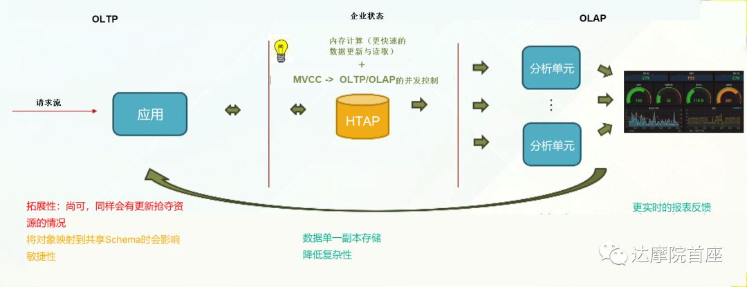 随着内存计算技术的发展,并且借助多版本并发控制(MVCC)能力,HTAP已经可以将OLTP和OLAP事务放在一个数据库上处理了。