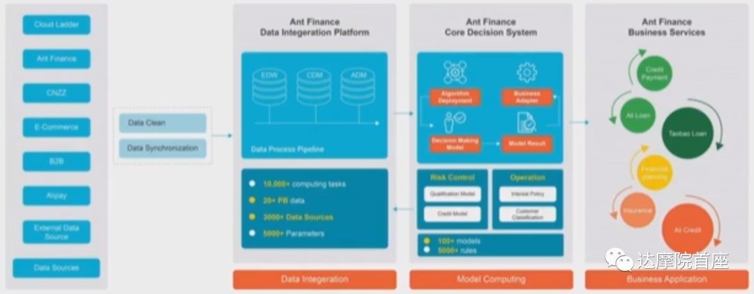 处理完成后进入模型计算,也就是蚂蚁金融的核心决策系统。针对不同场景,这里提供了超过100个AI数据模型来做风险控制以及运维管理,最后得出金融判断,包括贷款额度,信用评级等。