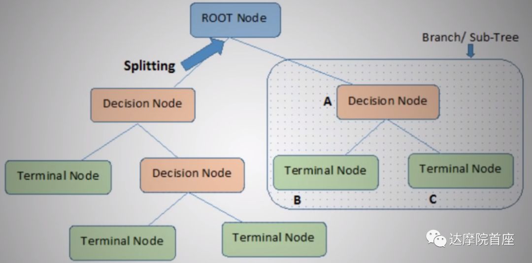 既然叫做决策"树",那一定是由一个主干节点和多个分叉节点及叶节点组成的,每个分叉都是一个决策,每一片叶子都是一个最终分类或取值(范围),