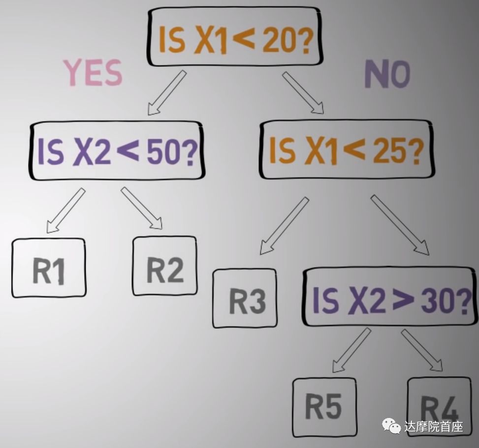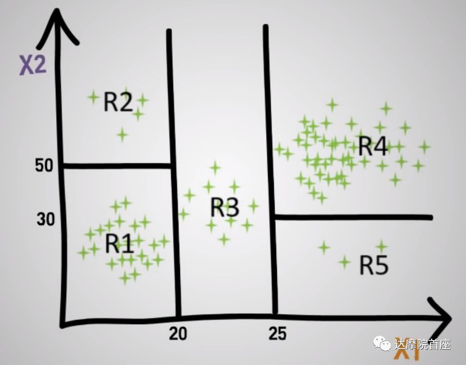 以下公布答案,我们从X1变量出发,通过两层三个决策点的判断就得出了全部5个叶子节点,您答对了么?