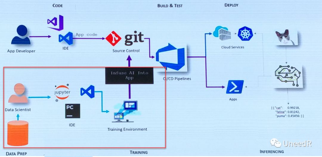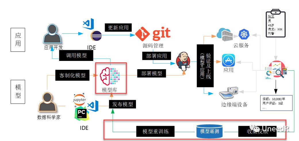 在企业已有CI/CD平台的基础上,并行接入机器学习的API接口是最初级的对接方式,由数据科学家在集成开发环境(IDE)中完成测试后,将训练环境的算法接口开放给应用,应用将元数据标签一一对接即可。