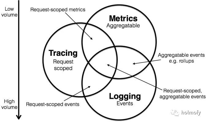 看了上面的图可能会有疑问:Metrics、Tracing都有了,那Logging为什么也不加到里面呢?其实Logging之所以没有进去,主要有两个原因: